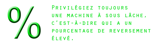 Privilégiez toujours une machine lâche. Par exemple, une machine programmée à un taux de redistribution de 95%, vous permettra de toucher 95€ chaque fois que vous en aurez joué 100€.